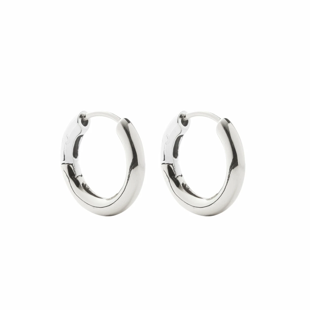 The model wears our Hinge Hoops and Perfect Huggies in Gold.