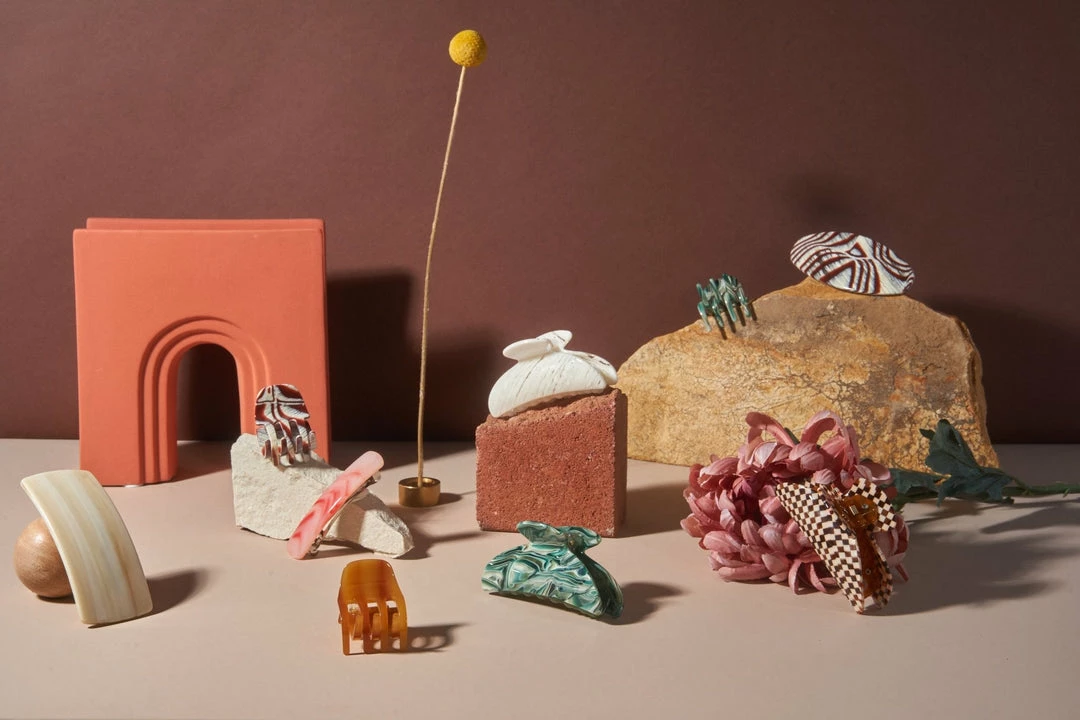 The model wears our Midi Heirloom Claw in Stromanthe.