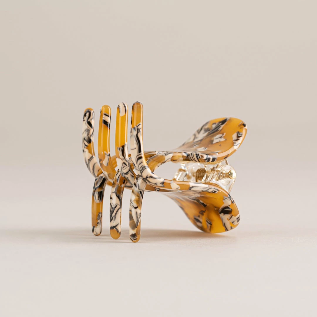 The model wears 2 of our Mini Claws in Canyon Brown.