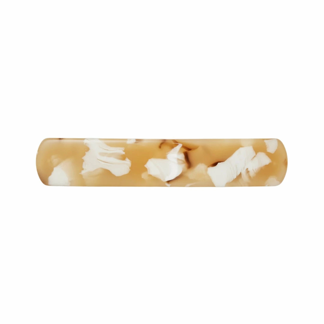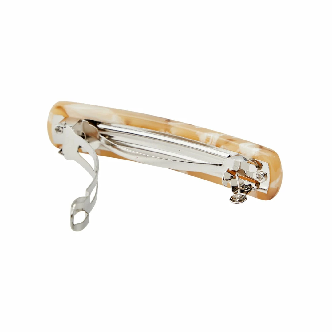 The model wears our (from top to bottom) No. 3 Heirloom Clip in Alabaster, Bizarre Checker, and Cognac.