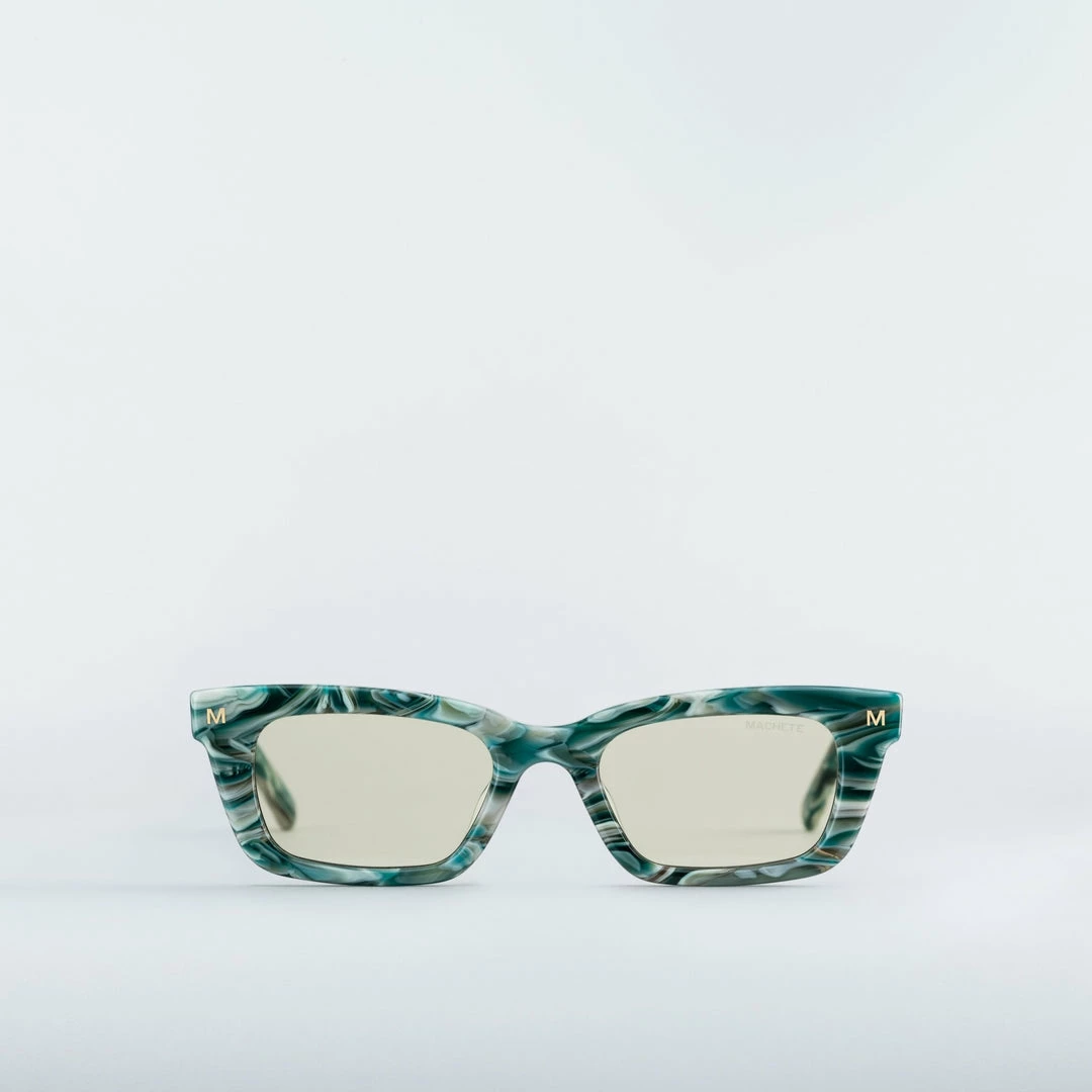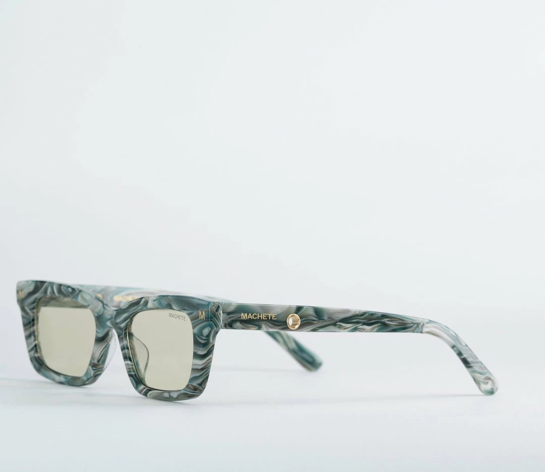 This ā90s inspired rectangular frame in Macheteās signature show-stopping acetate brings the chic style of this iconic decade to the modern era. Handcrafted from the most environmentally friendly and highest-quality acetate on the market today to ensure your frames will not only last but be kind to the planet as well. A gold Machete logo, hardware as well as a ring for your eyeglass chain at the temples.