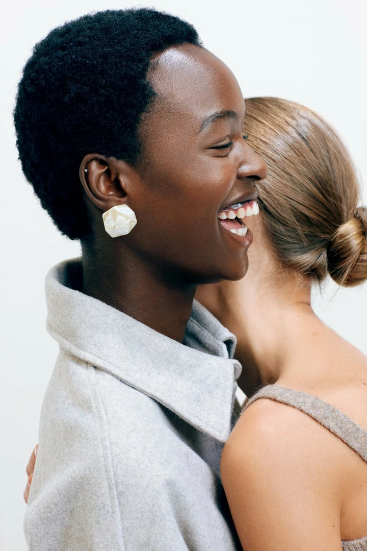 The model wears our Sculpture Studs in Ivory.Â