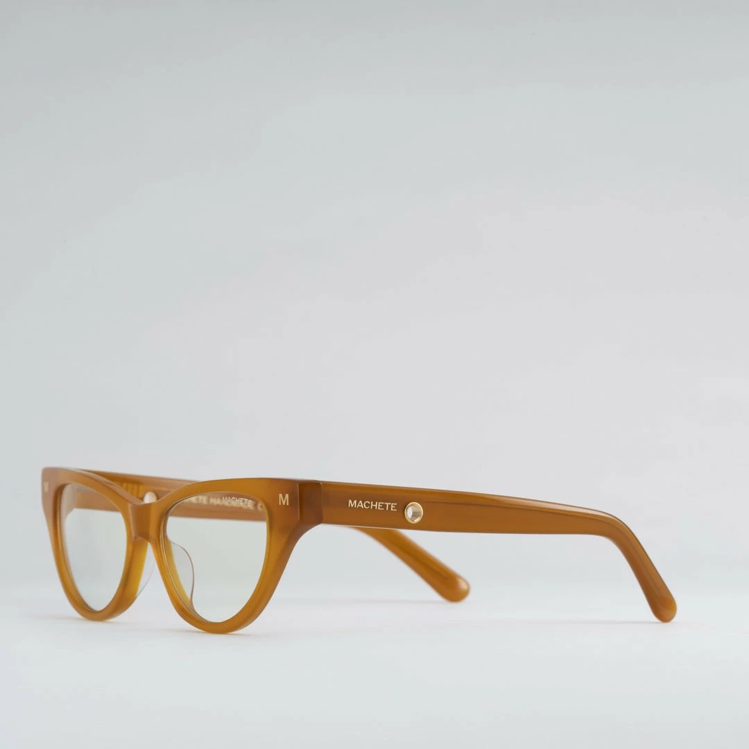 Take any ensemble to the next level with Suzy, our ultra-sleek narrow cat-eye frame. Handcrafted from the most environmentally friendly and highest-quality acetate on the market today to ensure your frames will not only last but be kind to the planet as well. Adorned with a gold Machete logo and hardware as well as a ring for your eyeglass chain at the temples.