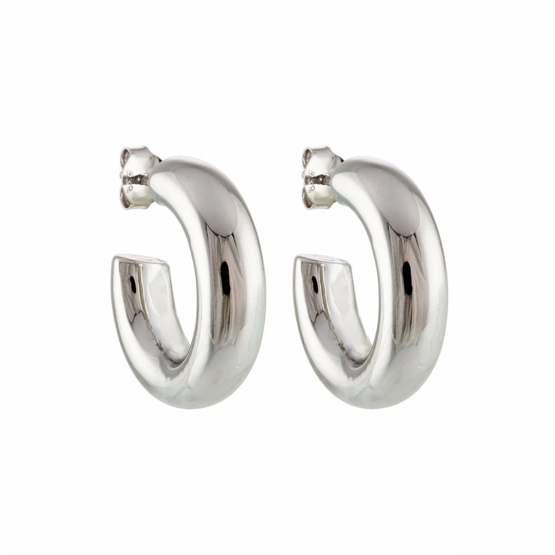 Model is wearing the .75″ Perfect Hoops in Silver and Maya Hoops in Gold.