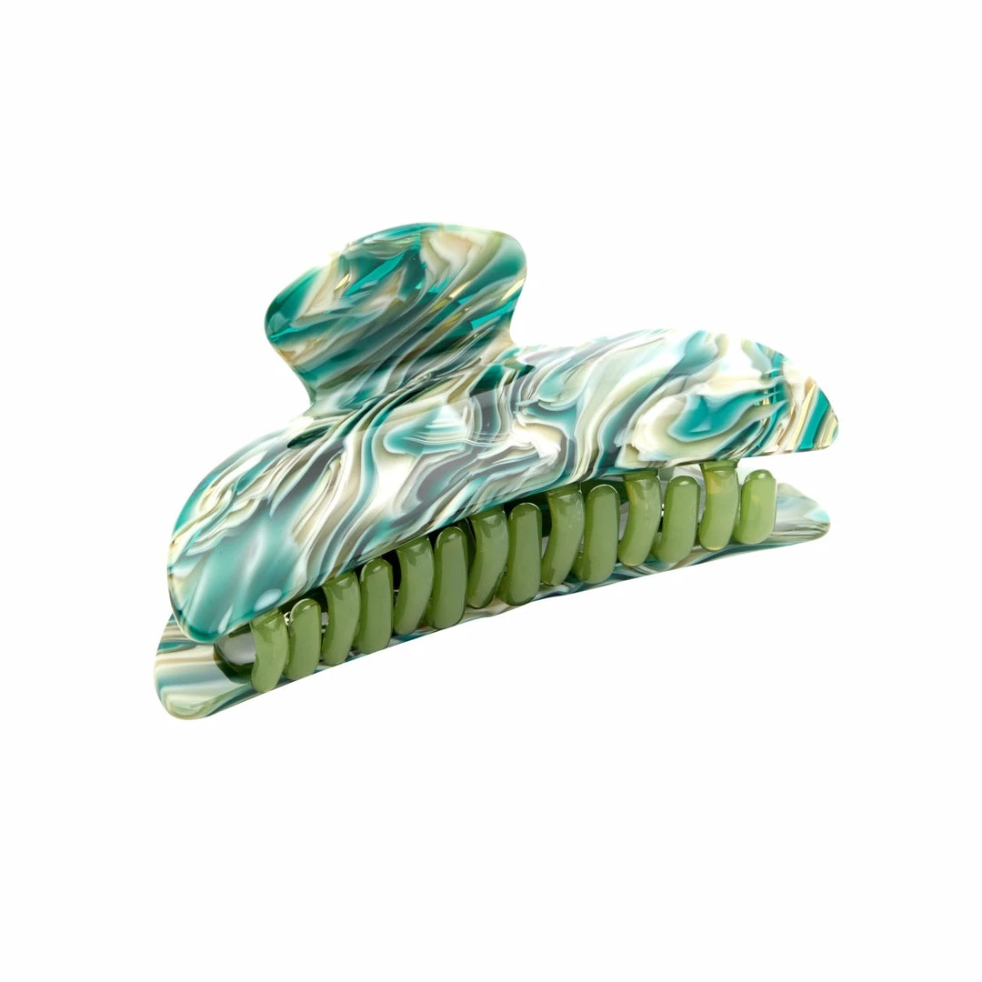 The model wears our Midi Heirloom Claw in Stromanthe.
