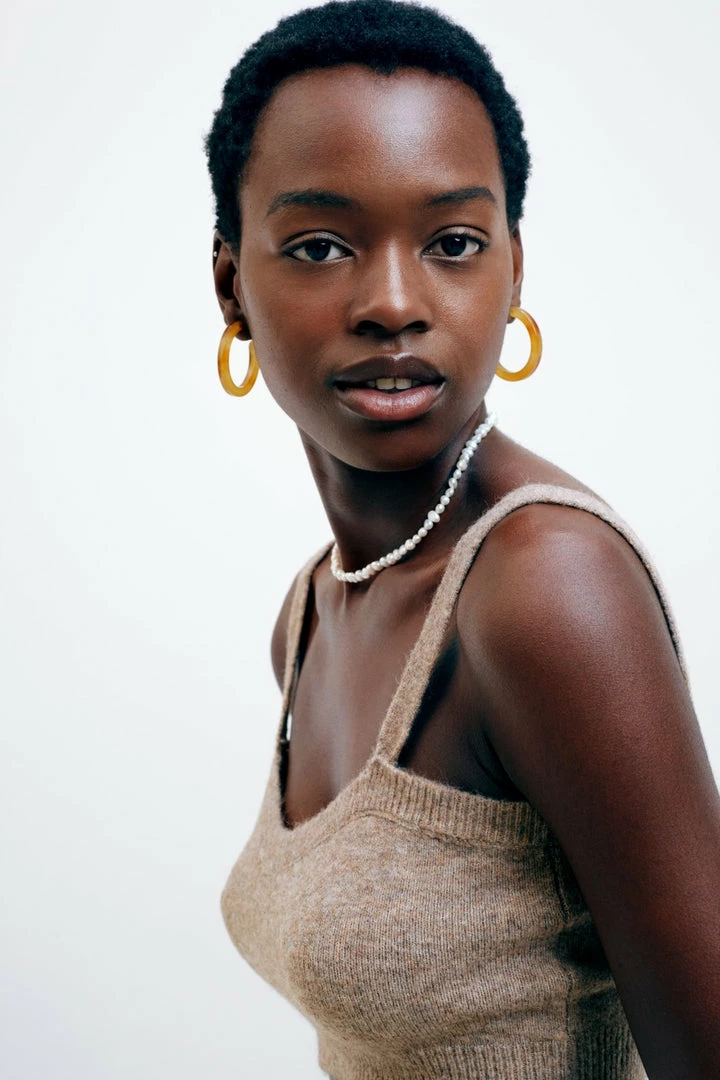 The model wears the Midi Hoops in Cognac and Freshwater Pearl Necklace in Cream.