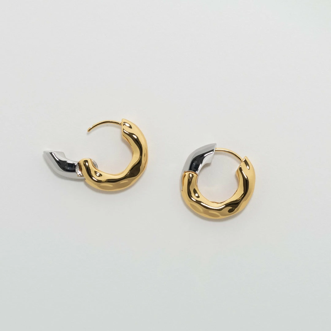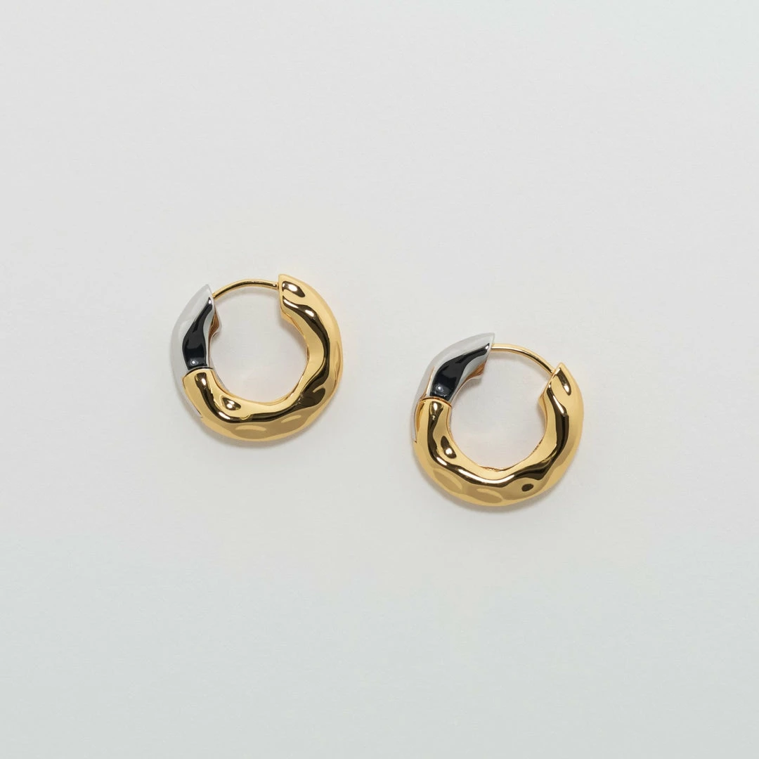 - Hinge-style hoop in gold and rhodium plated recycled brass. Measures approximately 1″ in diameter.